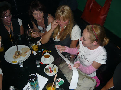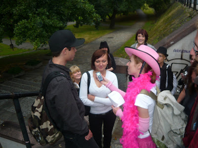 The girls were dressed as my 'gang' in hats, black trousers and white shirts, so we certainly drew a lot attention walking on one of the main streets in Warsaw with me interviewing male volunteers on the aspects of married life (that was after having climbed a 5 metre wall, breaking a nail and drinking lots of champagne on the way). The questions included: 'What does a good wife do for her husband?' (answers varying from 'Everything', 'She has to cook him a spaghetti/ an Apfelstrudel' to 'Nothing'), 'Will I be a good wife?' (after some intense evaluation of my looks: 'Sure you will') and 'What advice would you have for my future husband?' ( 'Go out with your wife, she seems such a party girl').
