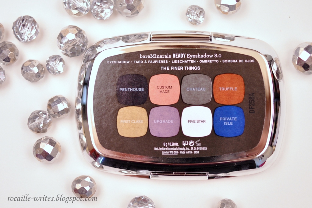 In terms of the shades themselves, I'm happy that I decided to purchase The Finer Things over LORAC Pro, because I would view the bareMinerals selection as 'neutrals with a twist' as opposed to more classic neutral shades. Left to right, we have Penthouse, a matte black with bigger silver shimmers, Custom Made, a pinkish champagne with a pearl finish, Cadeau, a medium satin grey with a violet twinge, Truffle, a warm metallic bronze, First Class, a unique antique gold/ platinum with a pearl finish, Upgrade, a medium purpley taupe (flail!), Five Star, a pigmented matte white, and finally Private Isle, a satin navy with a hint of purple. By the way, I find all the shade names adorable and very much in line with the feel of the palette; I might be silly but it really does evoke a sense of effortless luxury to me.
