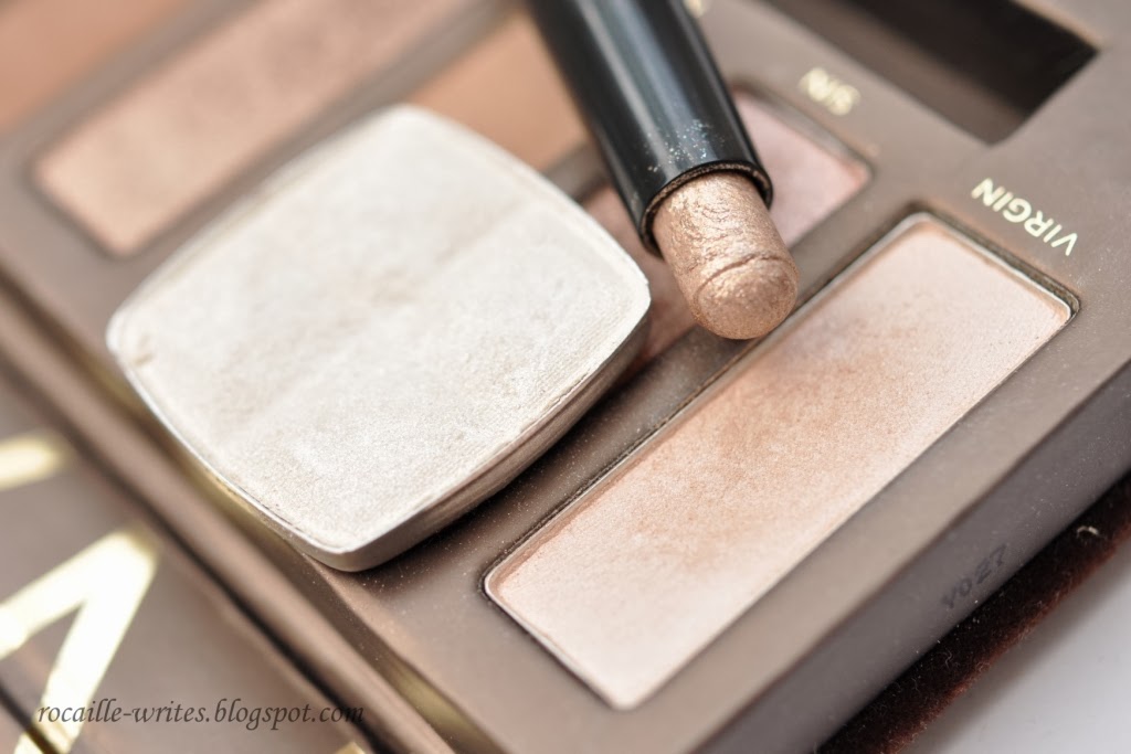 | L-R: NYX White Pearl eyeshadow, Urban Decay Virgin, Laura Mercier Caviar Stick in Sugar Frost, NYX Powder Blush in Angel, Revlon Superlustrous Shine Lipstick in Kissable Pink |