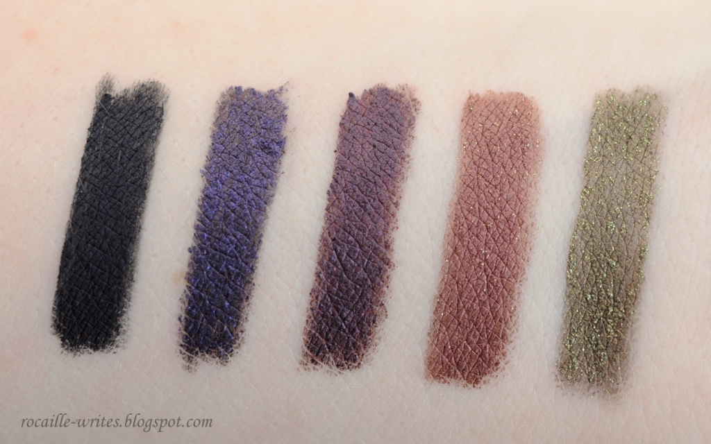 I have five shades now: Black Noir (pure matte black), Black Tulip (dark indigo pearl over a black base), Deep Plum (eggplant with very fine multidimensional shimmer, similar but more intense than Urban Decay Ransom), Copper Glow (reddish brown with gold micro glitter) and Sage Glow (golden olive with gold micro glitter). They're all equally smooth and creamy with the exception of Sage Glow, which is the most glittery shade - the consistency of that one seems a bit drier and not as intensely pigmented, but I remember from my UD liners that their glittery shades (like UD Gunmetal) suffered from a similar issue. That minor flaw aside, the glitter in Copper Glow and Sage Glow is small enough to give just a twinkle of light on the eyes, and stays put without migrating all over the face; I even applied Sage Glow to my waterline with no irritation whatsoever.