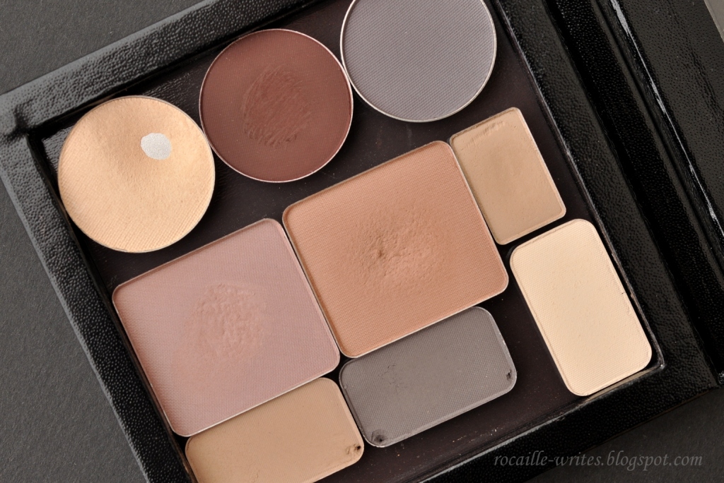 The three smaller rectangular pans come from my new drugstore acquisition, the Physicians Formula Matte Collection Eye Shadow Quad in Canyon Classics - I think I paid about $8 for it on Amazon. I bought it precisely with the thought of depotting it into the Z Palette, and while that process wasn't entirely pleasant (see the damage from a pin in the corners? Yeah, spare yourself the trouble and just melt the plastic underneath straight away), I'm very happy with these shadows.