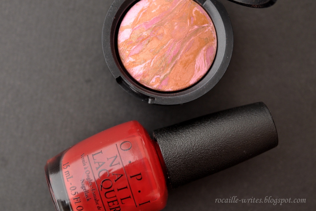 previously swatched here. While this is a warm shade with some brown undertones, there's still enough red in it to compliment even my pasty white hands. I'm also cheating a bit by including a rather color-inaccurate blush, the
