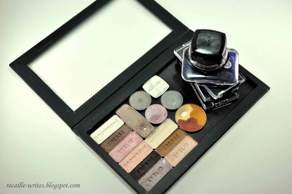 I decided on the no-heat method for depotting my shadows, using alcohol to dissolve the glue that holds the pan in its plastic packaging. I've found that some shadows were more difficult to depot than others, and also that the pans themselves seem to be made of different metals as some of them would not stick to the magnetized bottom of the palette! This was especially true for my Wet'n'Wild eyeshadow trios.