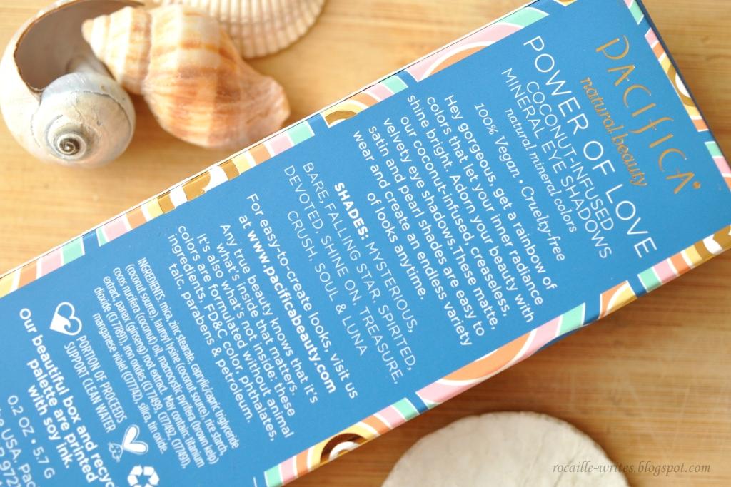 Power of Love is a compact palette of ten coconut-infused mineral eyeshadows, which the brand describes as 'velvety rich, long lasting, creaseless' and having ' a soft, cream-like finish'. Like all of Pacifica products, they're 100% vegan and cruelty-free. The shadows are housed in a slim, streamlined carboard palette with a clear top so that you can see all the shades easily at a glance. One thing that slightly annoys me about the design is that even though the brand lists the shade names on the back of the outer box, the shadows are not actually named within the palette so I have no idea which name goes with which shade if that makes sense - it's like they wanted to name them but didn't commit to doing so all the way through. Huh.