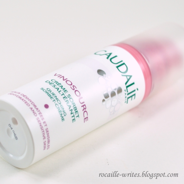 I then turned to Caudalie Vinosource Quenching Sorbet-Creme for Dehydrated and Sensitive Skin ($40 for 1.3 oz/40ml) as my hydrating moisturizer of choice. The Caudalie cream claims to 'restart internal hydrating mechanisms and restore water reserves' with grape seed polyphenols, organic grape water and fortifying and moisturizing Vinolevure. The product has a light, liquidy cream texture that absorbs quickly, but leaves a bit of a shiny/sticky residue on the skin. It's also very heavily perfumed, which is a bit counterproductive for a product aimed at sensitive skin. My biggest gripe with this Sorbet-Creme however is that I don't really think it provides any lasting hydration to the skin - so I wouldn't really recommend this one to be honest, despite many rave reviews around the blogosphere.