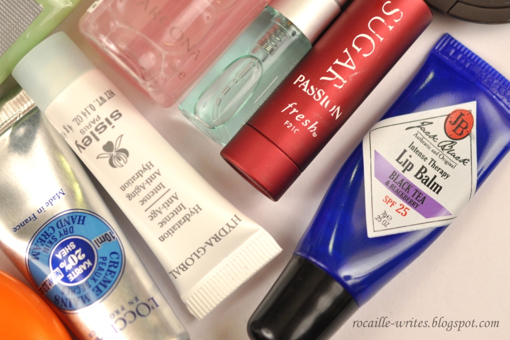 Lastly, for lips I've managed to be quite restrained and only pack three products: a Guerlain Rouge Automatique in Shalimar for a cool bold pink, a MAC Viva Glam V for a pinky neutral, and a Fresh Sugar Treatment lip balm in Passion for a sheerer juicy red. I might also pack a neutral lipgloss like Clarins Lip Perfector in Rose Shimmer in my carry-on for shine and hydration on the go.