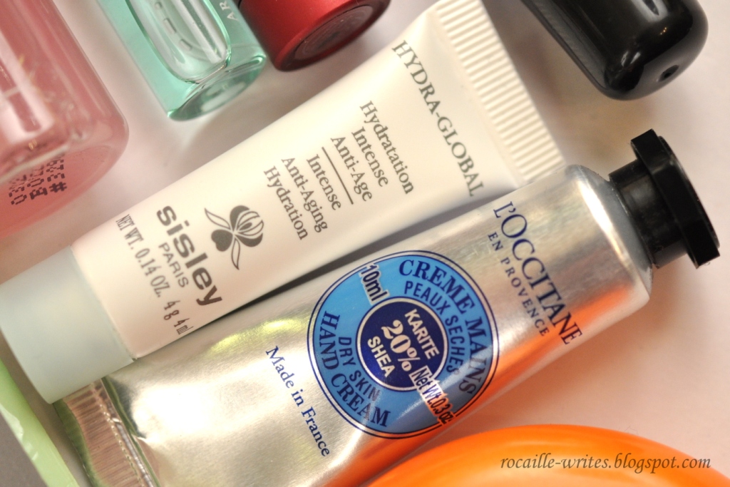 For showering, I took the Korres Mini Showergel in Fig, but to be honest, I'm not a fan of neither the gel itself nor the scent. I also tucked in a little sample of The Body Shop Brazilian Nut Body Scrub; now, this is deliciously fragranced and quite effective, and I'd used up the pot in 2 applications. Last but not least, perfume: my current favorite is Tocca Cleopatra, a beautifully warm and feminine 'floriental' with a touch of fruit. I've been using my sample for at least 2 weeks and it's still going strong!