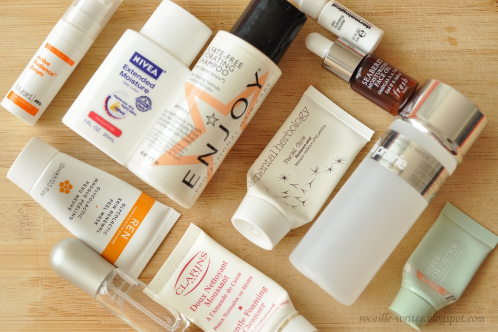 Yay, that's 10 more than last month! I actually thought I was going to have less this month because I slacked a little at the beginning of June, but I really pulled through at the end. These samples come from a lot of different categories: bodycare, haircare, skincare, even make-up (a couple primers and liquid highlighters). I still have a few stragglers that aren't completely empty yet, so expect to see them in my regular empties round-up.