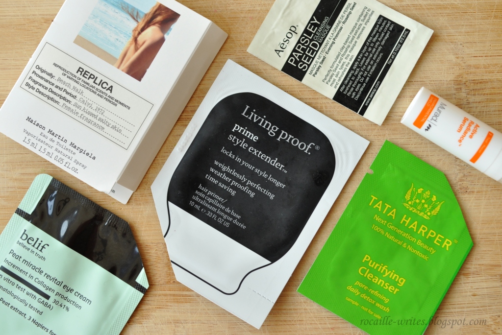 As for my sample favorites, I haven't really discovered anything absolutely mindblowing that I need to run out and purchase right away (thank God! Like I need any more products...), but I would consider buying the Aesop Parsley Seed Cleansing Masque and the Tata Harper Purifying Cleanser in the future; they're both quite pricey, but still in my budget. While I did really enjoy my sample of the glycolic-heavy Murad Active Radiance Serum, at $90, I consider it to be too expensive for an exfoliating treatment. The belief Peat Miracle Revival Eye Cream was fantastic to wear under concealer during the day, the Maison Martin Margiela REPLICA EDT in Beach Walk smelled lovely but was rather short-lived, and speaking of fragrance, I always enjoy the bergamot-scented Living Proof line; while I wouldn't repurchase Prime Style Extender necessarily, I have my beady eye on the Full Thickening Cream.